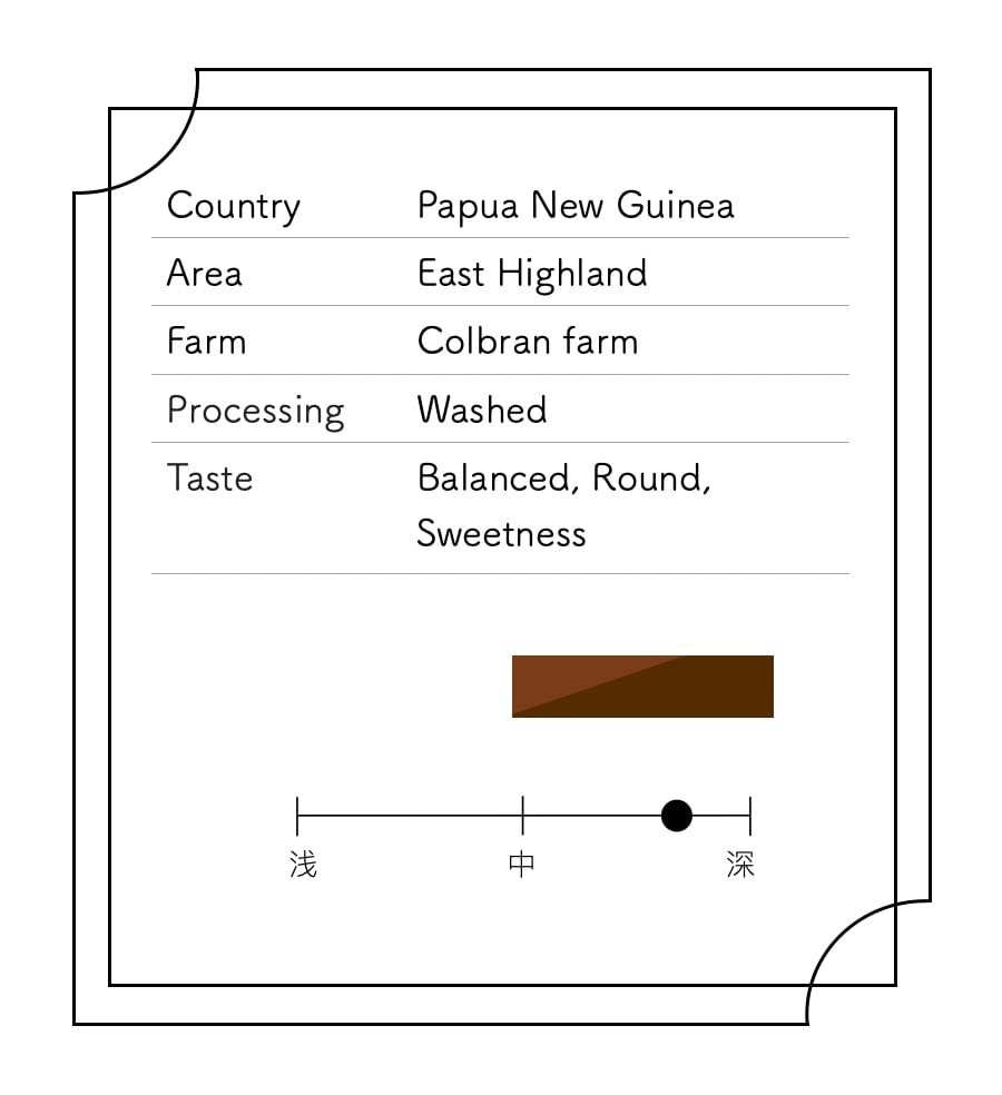 どっしりとしたボディとほっくりとした甘さが特長のパプア ニューギニア コルブラン農園 Washed。深煎りながらも、飲みやすく、満足感を与えてくれる一杯です。